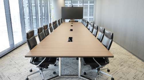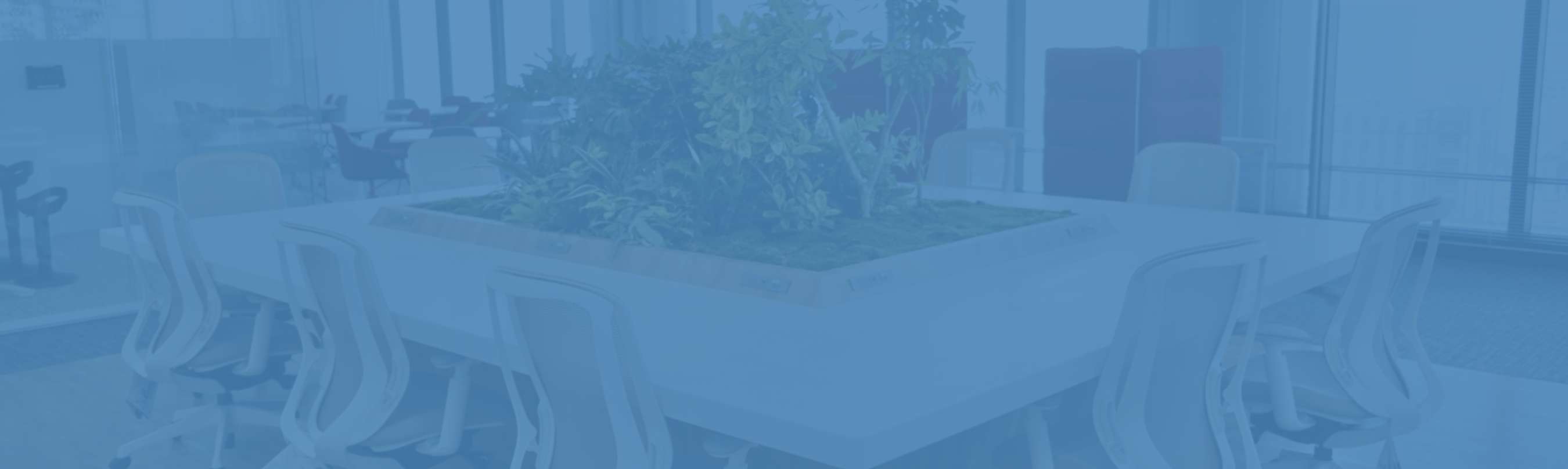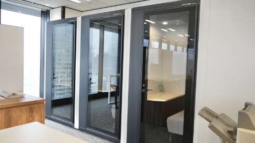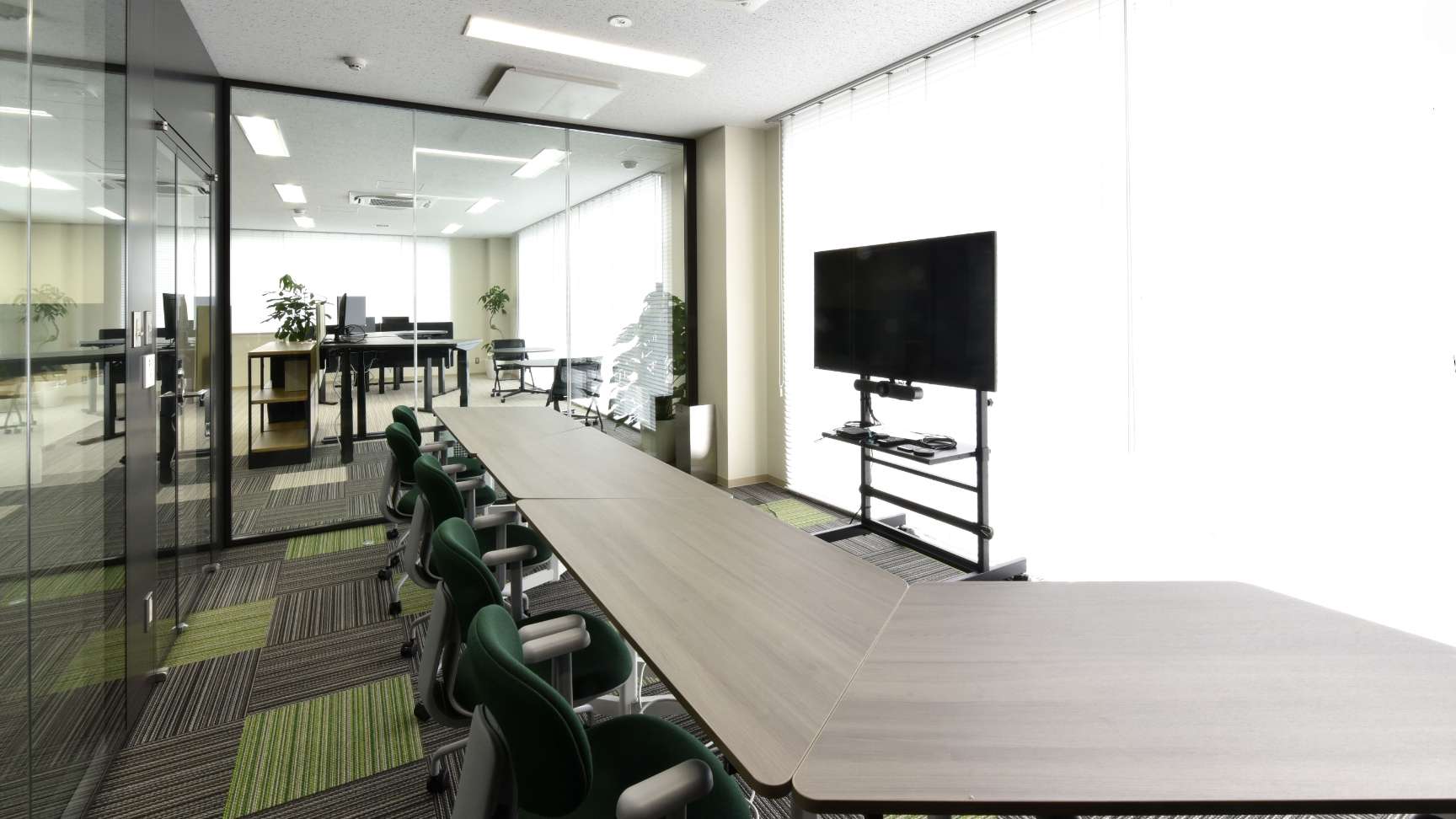 社外ミーティングエリア すべてのミーティングルームはブルーとグリーンのグラデーションカラーのレースカーテンが装備されています。