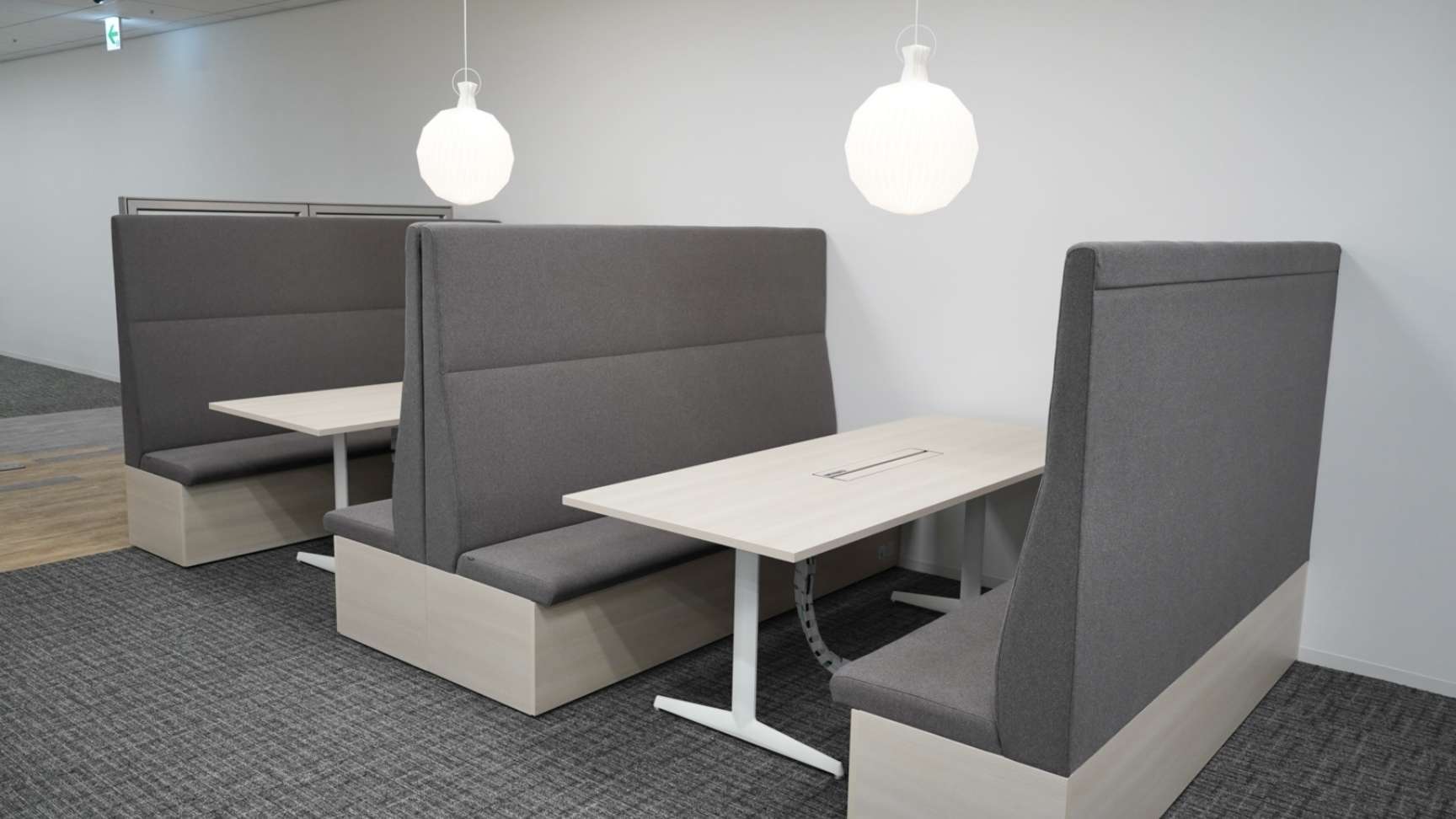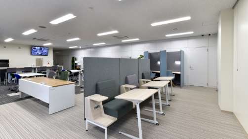 気軽にコミュニケーションが取れる丸テーブルやオープンディスカッション用のディスプレイ付きソファ席があります。