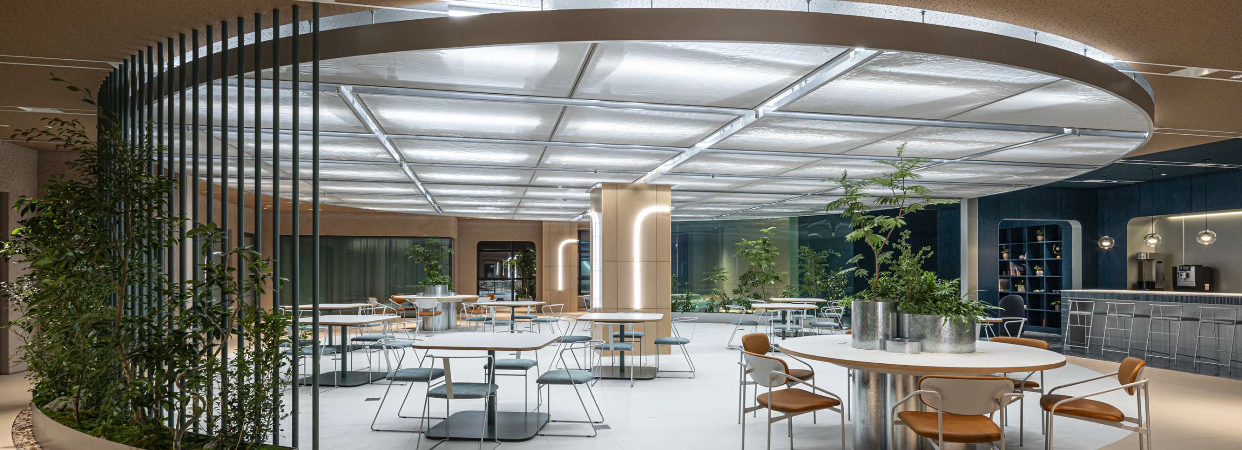 ラウンジエリア お客様とのミーティングルームへ向かうラウンジエリアは円形の空間となっています。