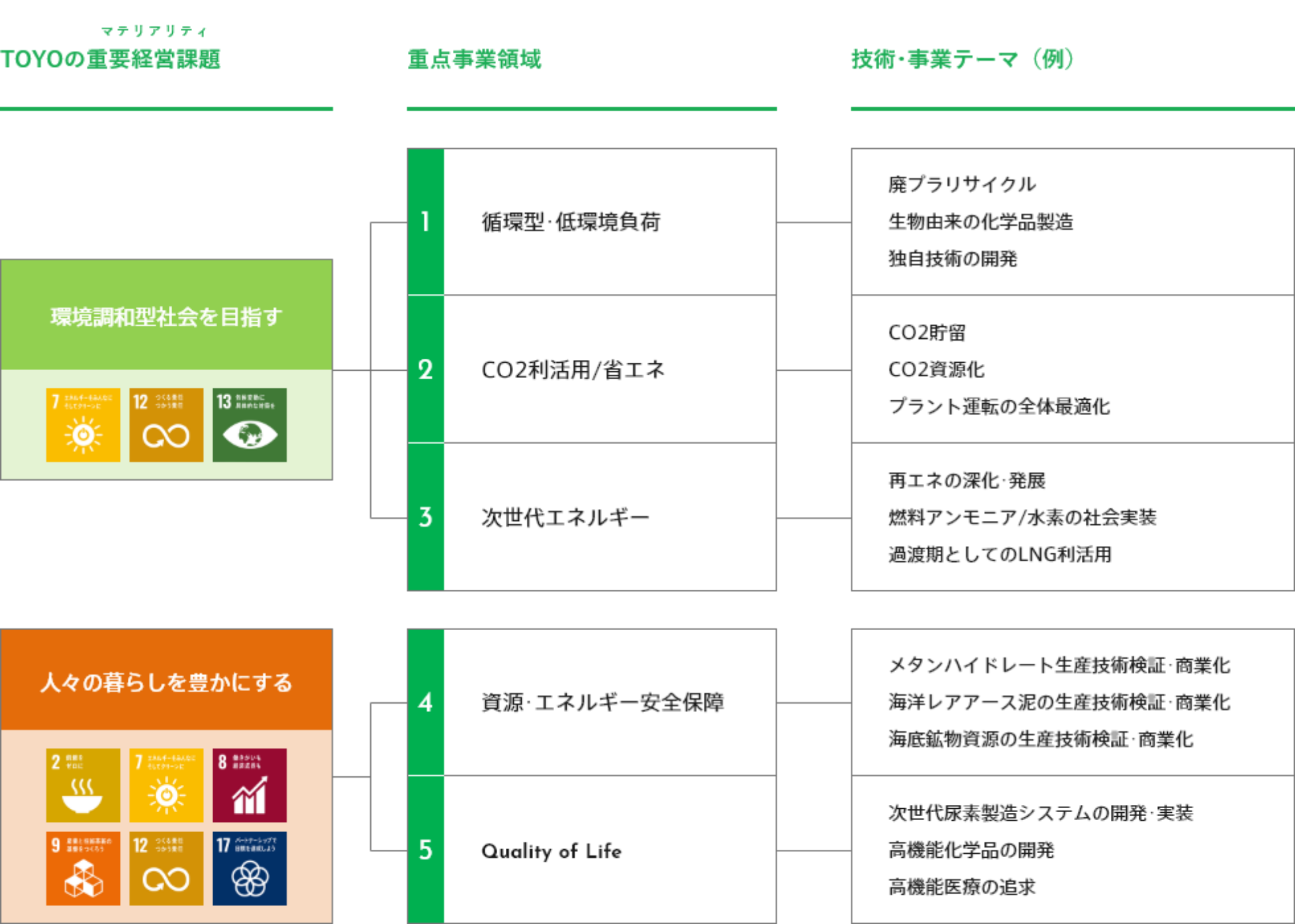 この使命(MISSION)は、常にTOYOの企業活動の中心にあるものです。ここでいうエンジニアリングとは、さまざまな要素技術を統合し、全体システムの最適化を実現すること。そして、エンジニアリングの遂行を通じて、多様な顧客課題を総合的に解決し、顧客のニーズに応えるとともに、エネルギーや素材などの供給と環境保全を調和させ、持続性のある地球社会の実現に貢献することを目指しています。